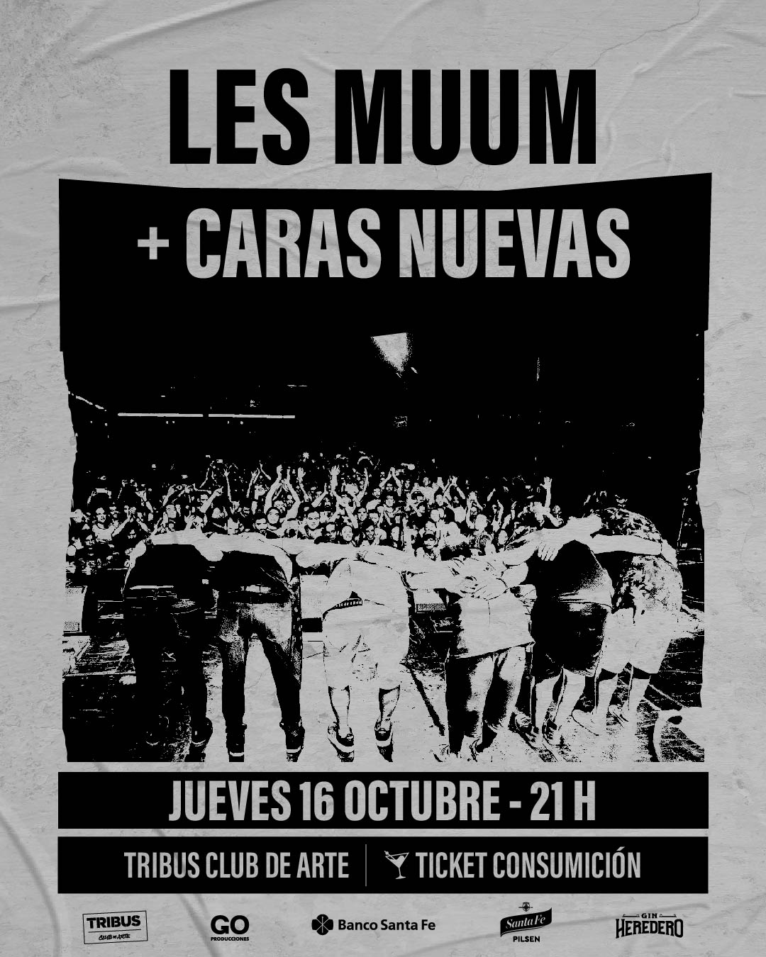 JUEVES  16 D E  OCTUBRE  A  LAS  21 H SV ení a  T ribus p ara  vivir  una  noche c on e l  mejor r ock l ocal  de l a m ano d e  Les  Muum y   Caras  Nuevas.  Les  Muum  presentará  nuevas  canciones  en u n s how  conceptual  que  remite  al  universo  de  Alejandro  Dolina i ncluyendo v isuales  junto a  c limas  bailables y  n ostálgicos. E n  tanto q ue  Caras  Nuevas  se  presenta p or p rimera  vez  en  Tribus  con s u f ormato  banda c ompleta,  adelantando  temas  de  su  próximo m aterial. A dquirí  tu t icket v álido p or  una  consumición en boletería de Tribus.