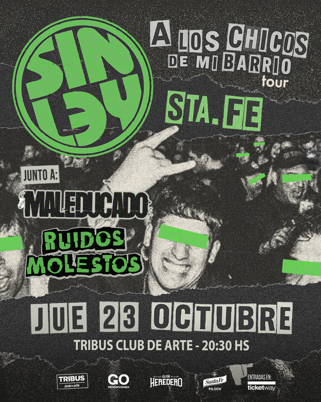 El jueves 23 de octubre a las 20.30 h, después de ocho años, Sin Ley, la legendaria banda de punk rock regresa a Santa Fe en el marco del tour nacional “A los chicos de mi barrio”. Como invitados estarán Maleducado y Ruidos Molestos. Entradas a la venta en boletería y a través de Ticketway.
