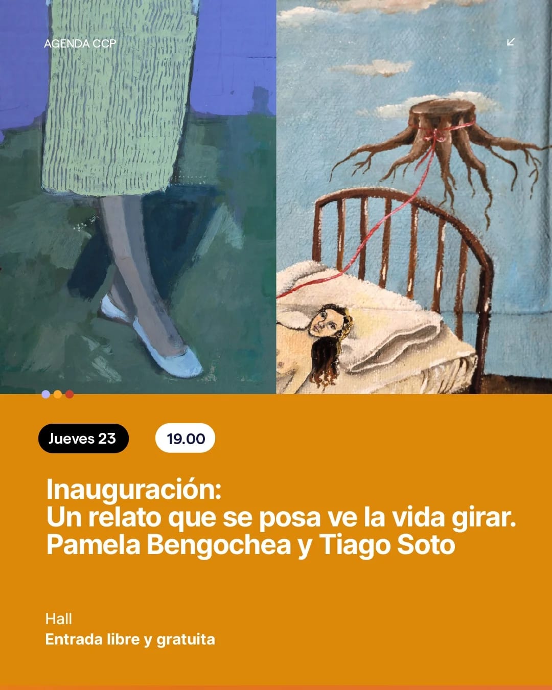 Jueves 23 – 19 h📍 Hall Ricardo Supisiche----Inauguración: Un relato que se posa ve la vida girar Pamela Bengochea y Tiago Soto🎟️ Entrada libre y gratuita