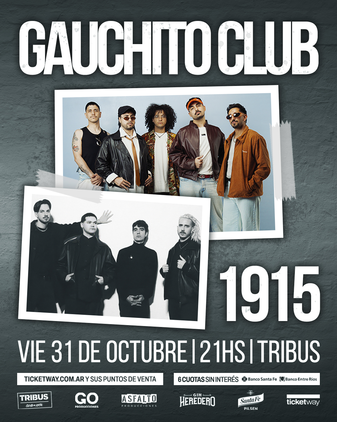 VIERNES 3 1 D E OCTUBRE A LAS 20 HS: Gauchito Club y 1915 s e u nen e n un s how e xplosivo que mezcla frescura, e nergía y lo m ejor de l a n ueva escena argentina. E ntradas a la venta en boletería de Tribus y a través de Ticketway.
