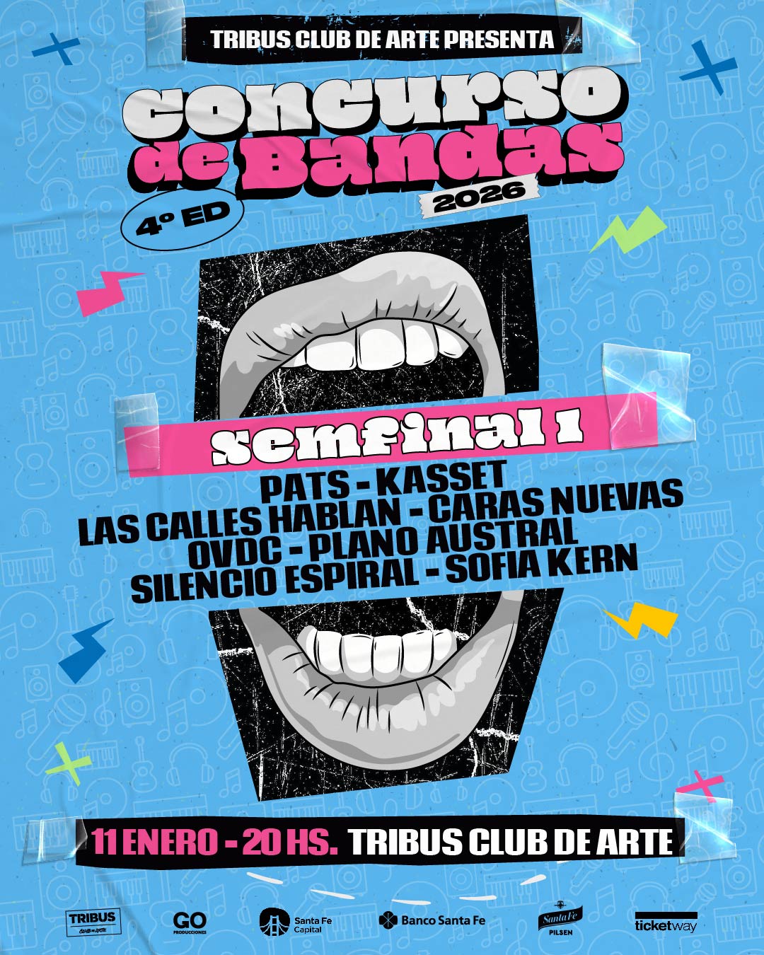 DOMINGO 11 DE ENERO A LAS 20 H S: Llega la p rimera semifinal del Concurso de Bandas 2026 con los shows de Pats, Kasset, Las Calles Hablan, Caras Nuevas, O VDC, Plano Austral, Silencio Espiral y Sofia Kern. Adquirí tu ticket en la boletería de Tribus y a través de Ticketway.