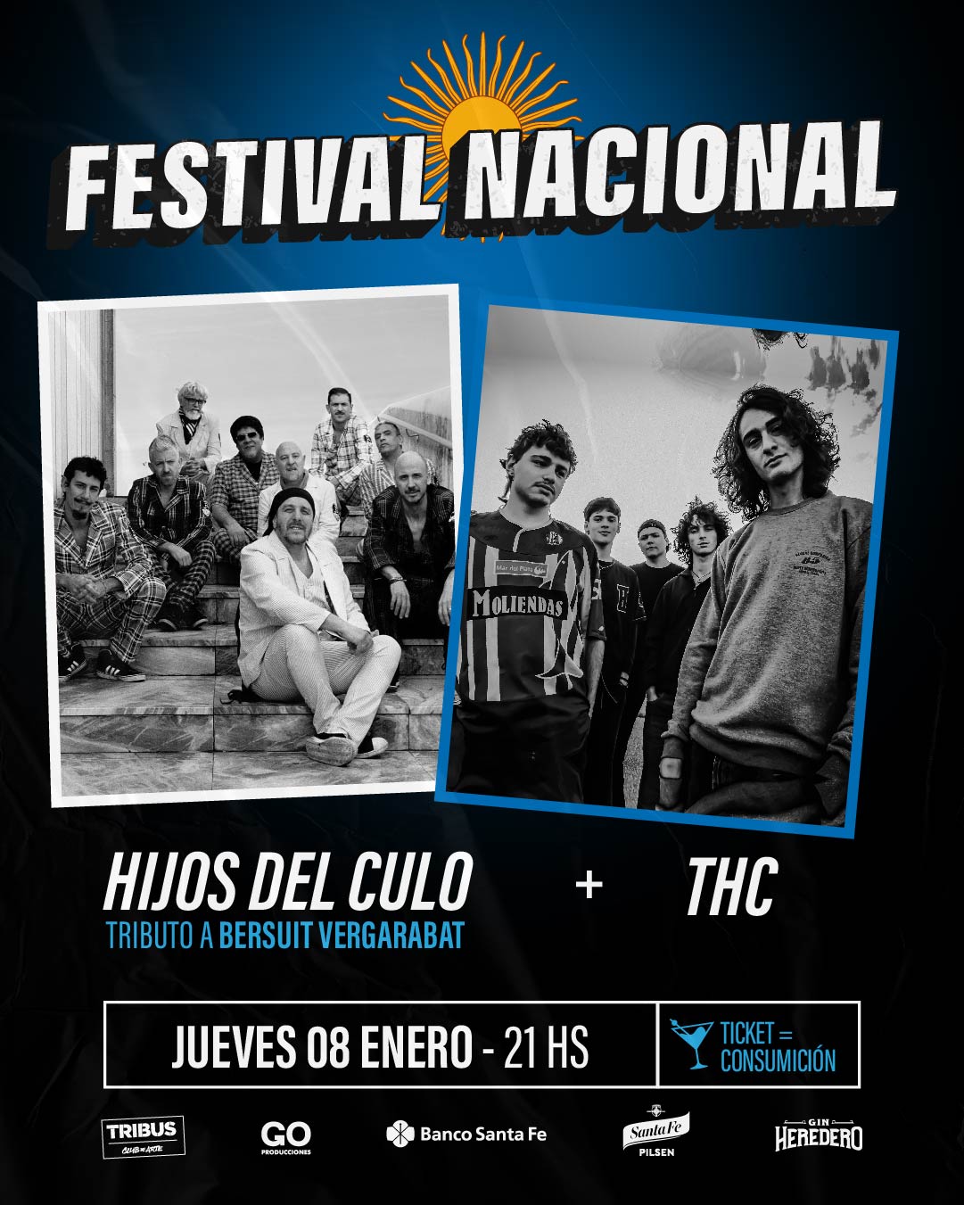 J UEVES 8 D E ENERO A L AS 2 1 HS: El Festival Nacional regresa a Tribus con los shows de Hijos del Culo (tributo a Bersuit) y THC. Adquirí tu ticket válido por una consumición en la b oletería de T ribus.