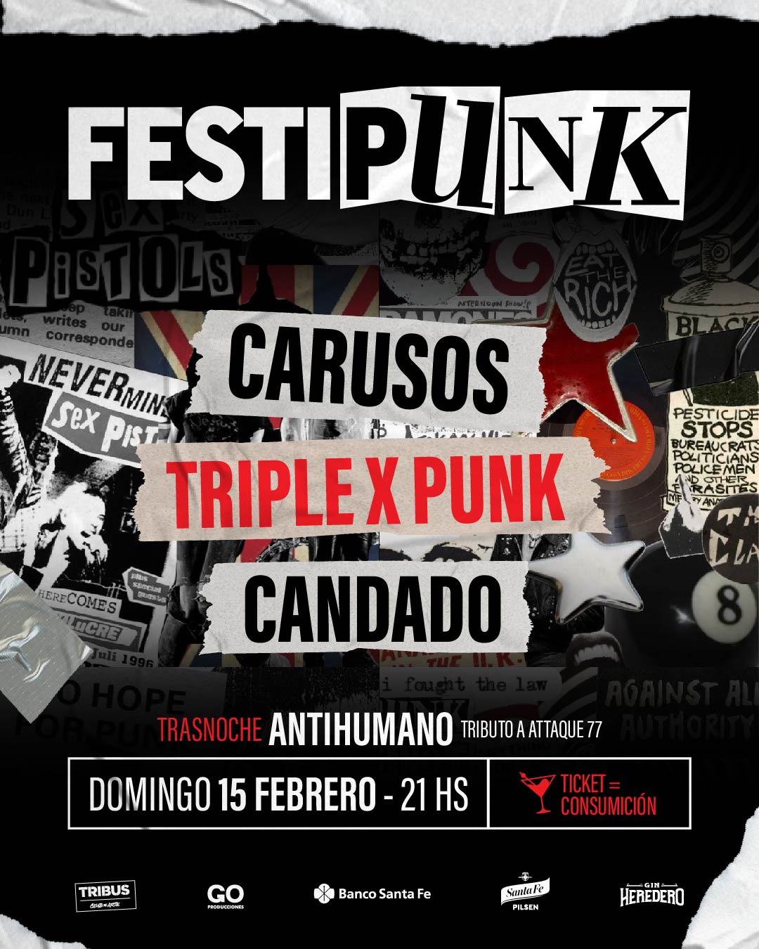 DOMINGO 15 DE FEBRERO A L AS 21 HS: E l F estipunk t e t rae u na noche c on l os m ás destacados exponentes del p unk local: Carusos, T riple X Punk y Candado. Adquirí t u ticket v álido p or una consumición en la boletería de Tribus.