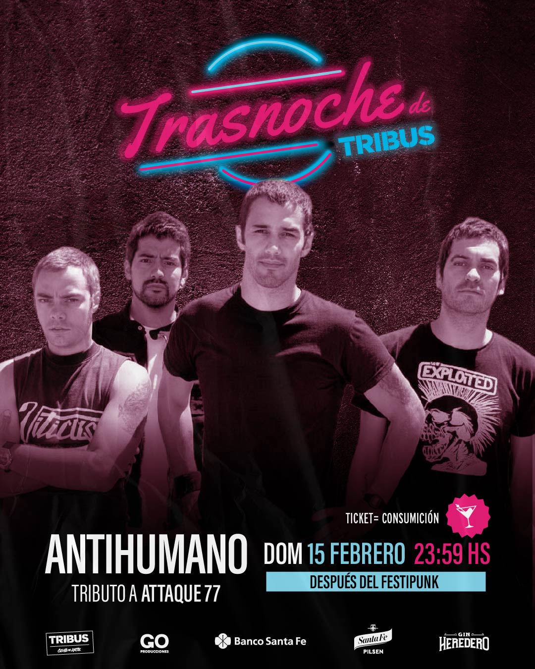 DOMINGO 15 DE FEBRERO A LAS 23.59 HS: D espués del Festipunk, la fiesta sigue de la mano de Antihumano (tributo a Attaque 7 7). Adquirí tu t icket válido por u na consumición e n l a b oletería de Tribus.
