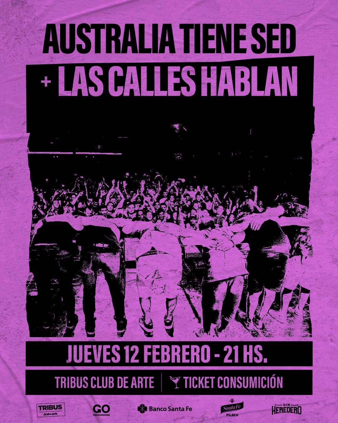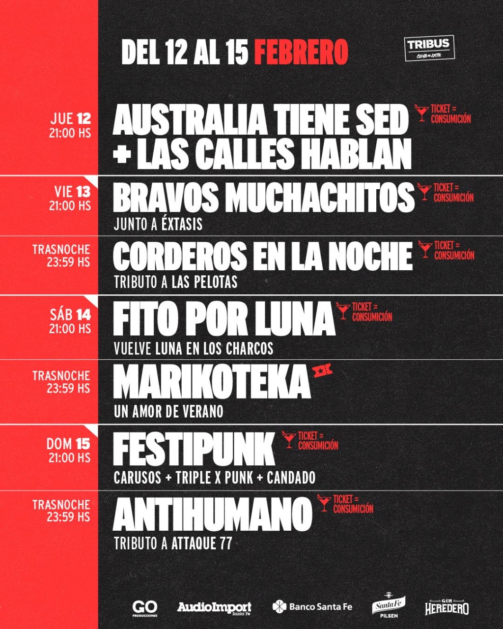 La programación semanal en Tribus Club de Arte se extiende del jueves 12 al domingo 15 de febrero e incluye: Australia Tiene Sed junto a Las Calles Hablan;