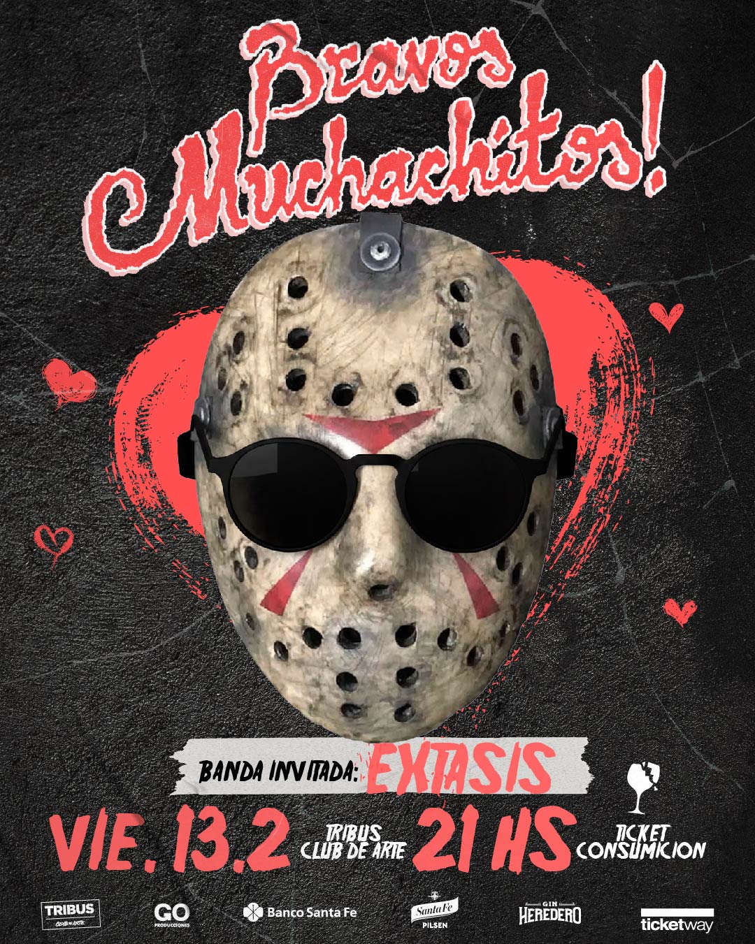 VIERNES 13 DE FEBRERO A L AS 2 1 H S: Bravos Muchachitos! t e i nvita a disfrutar del V iernes 13 o l a P revia del Día de l os E namorados con las mejores versiones d e L os R edondos y el I ndio Solari. Como b anda i nvitada e stará Éxtasis. Adquirí tu t icket válido p or una c onsumición en Ticketway o e n la boletería de Tribus.