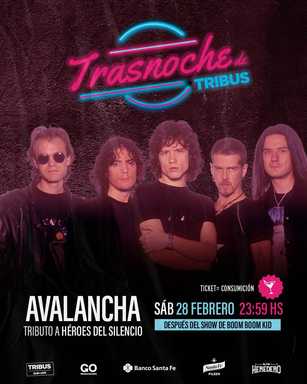 SÁBADO 28 DE FEBRERO A LAS 23.59 HS: El Trasnoche de Tribus llega con Avalancha y todos los clásicos de Héroes del Silencio. Adquirí tu ticket válido por una consumición en la boletería de Tribus.