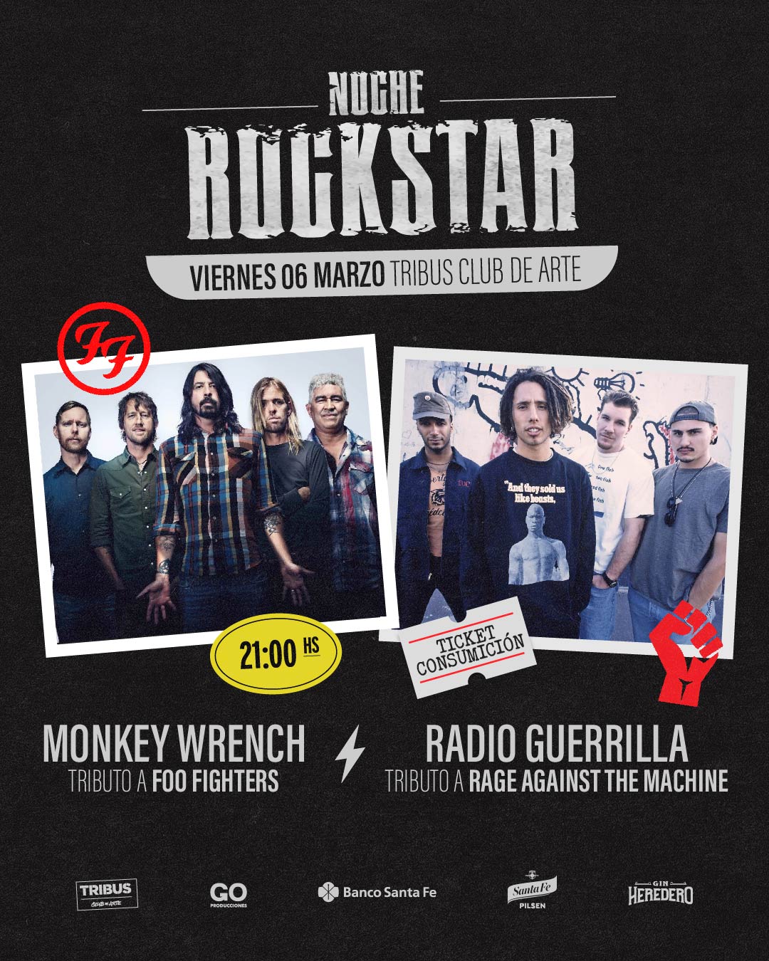 El viernes 6 de marzo a las 21 h, la Noche Rockstar regresa con los shows de Monkey Wrench (Tributo a Foo Fighters) y Radio Guerrilla (Tributo a Rage Against The Machine). Adquirí tu ticket válido por una consumición en la boletería de Tribus.