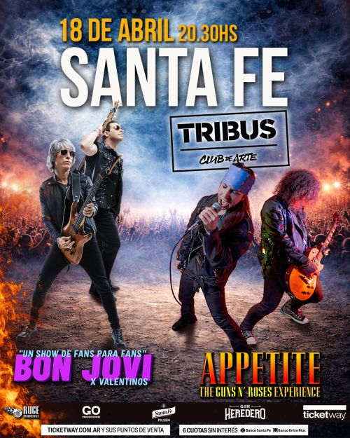 SÁBADO 18 DE ABRIL A LAS 20.30 HS: Vení a vivir una noche única con los mejores homenajes a dos bandas clásicas de la historia del rock: Appetite (The Guns N Roses Experience) junto a Bon Jovi por Valentinos. Entradas a la venta en boletería y a través de Ticketway.